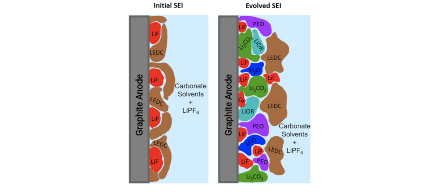 SEI-слой состоит из разных соединений лития: фторидов, оксидов, карбонатов. Вот как схематически выглядит новая и старая батарея со всем этим зоопарком элементов: